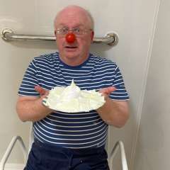 Big Bird the Clown had a pie put on a stool to be sat on by Pains Grey